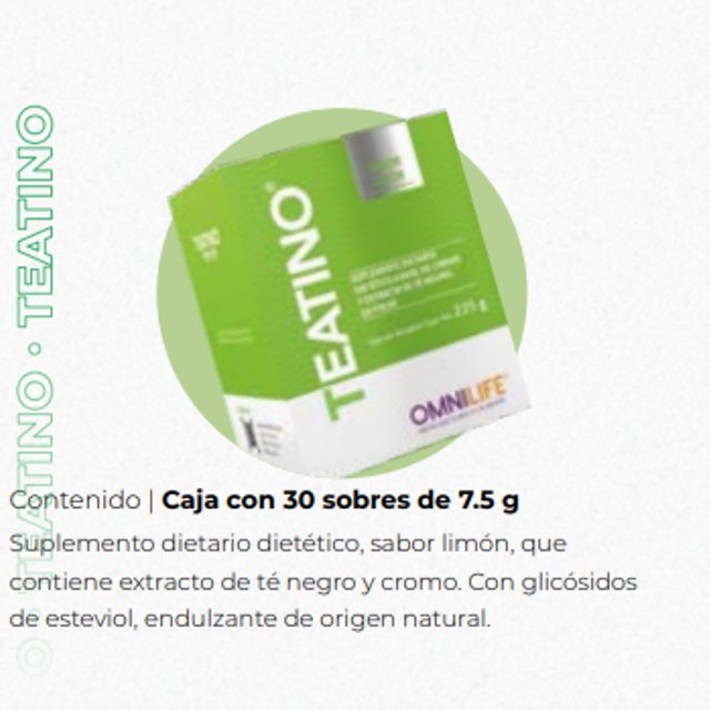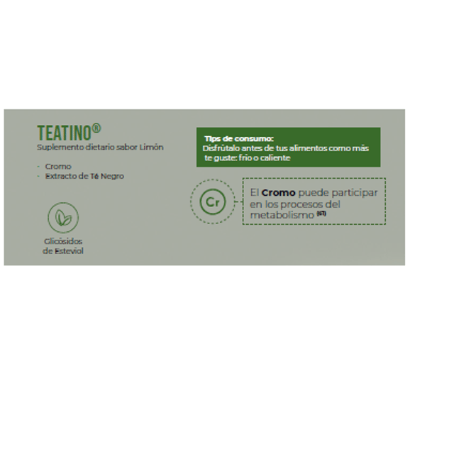 Caja con 30 sobres de 7.5 g Suplemento dietario sabor limón a base de extracto de té negro y cromo que participa en los procesos metabólicos y Endulzado con glicósidos de esteviol de origen natural.