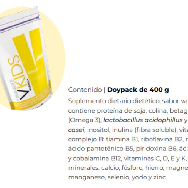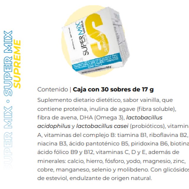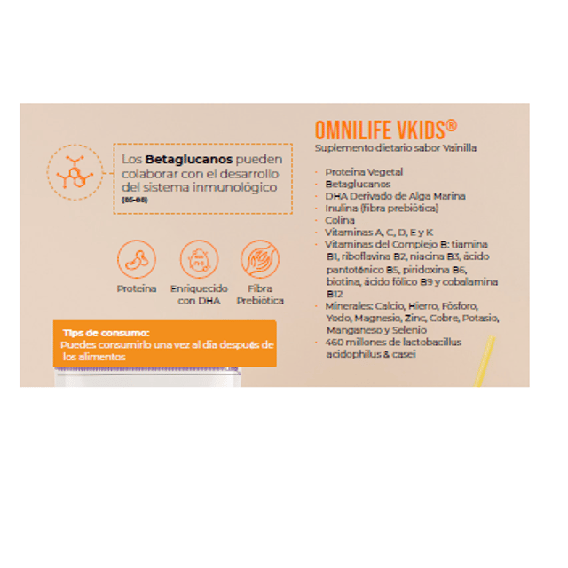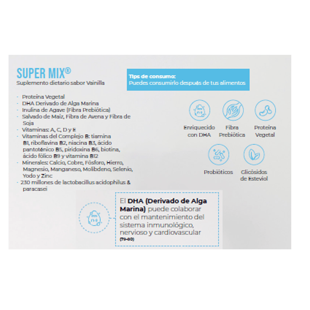 Caja c/30 sobres de 17 g Malteada sabor vainilla con proteína, carbohidratos, Omega 3, fibra, vitaminas y minerales, El DHA colabora con los sistema inmunológico, nervioso y cardiovascular