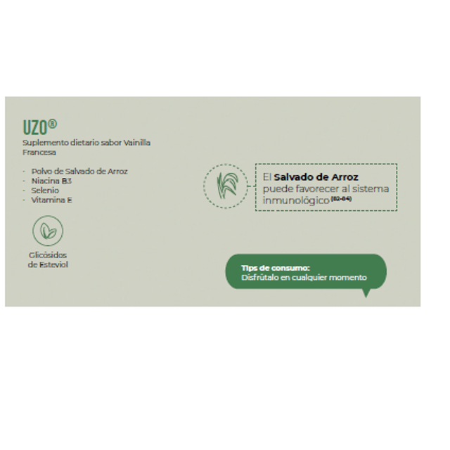 Caja c/30 sachets de 8g Producto nutricional sabor vainilla francesa, con salvado de arroz y selenio, que colabora a la formación, desarrollo y activación de las natural killers células de defensa