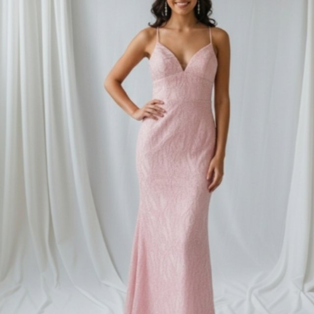Rosa pastel, lentejuelas bordadas en floral, escote V y espalda descubierta con tirantes cruzados. ¡Sensual, elegante y listo para brillar!